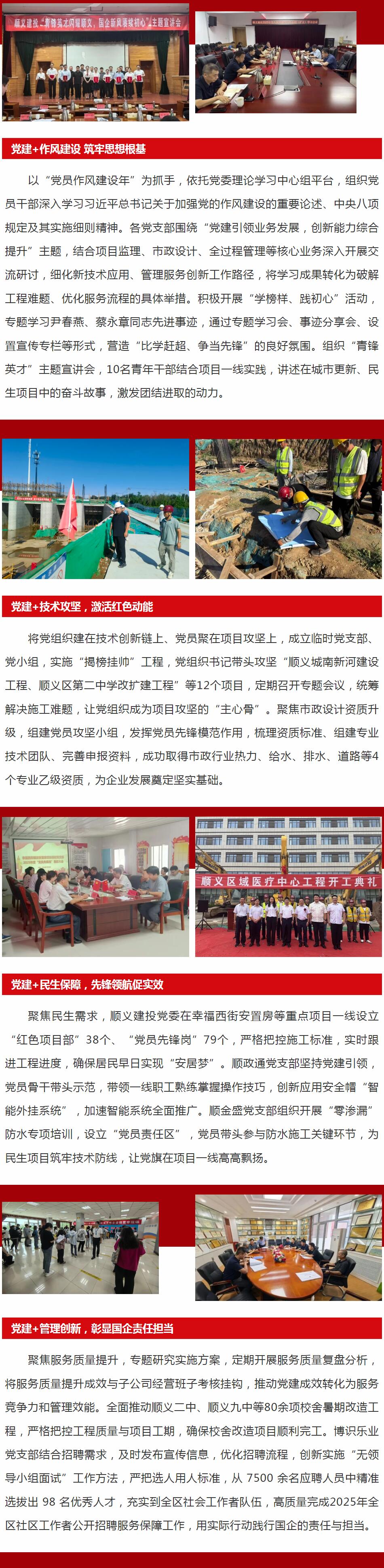 順義建投黨委堅持黨建引領(lǐng),以 “紅色引擎” 凝聚發(fā)展合力,在重大項目攻堅、民生工程推進(jìn)、服務(wù)質(zhì)量提升等領(lǐng)域主動作為,不斷激發(fā)國企創(chuàng)新發(fā)展活力,全力打造特色黨建品牌,為區(qū)域發(fā)展貢獻(xiàn)順義建投力量。