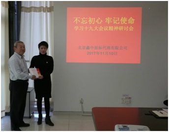 副經(jīng)理王珺向北京鑫中招標代理有限公司黨支部贈送學習資料。