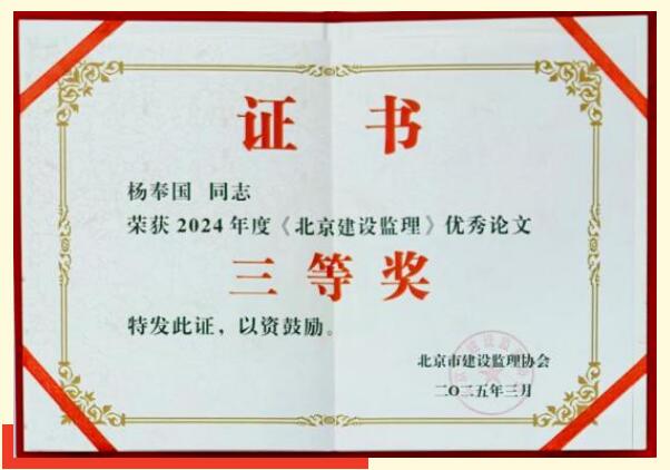 再接再勵(lì)楊奉國(guó),總監(jiān)理工程師,撰寫的《鋼筋混凝土灌注樁樁基施工鋼筋籠上浮原因及處理措施淺析》榮獲“2024年北京建設(shè)監(jiān)理優(yōu)秀論文”三等獎(jiǎng)。