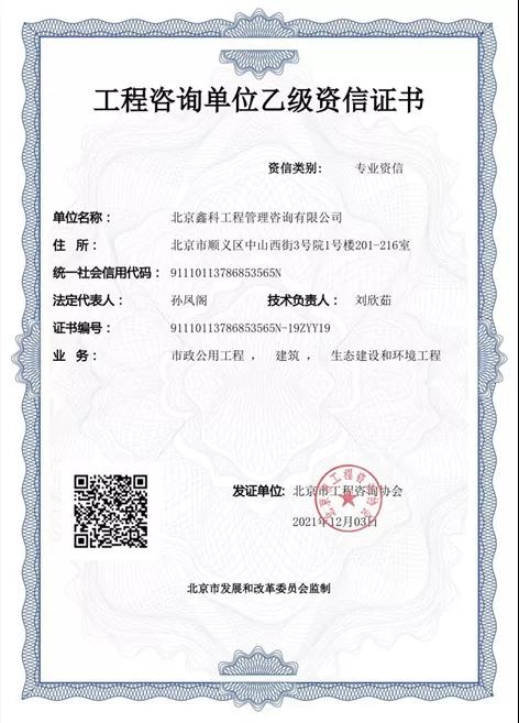 在順義建投公司黨委的堅強領導下,鑫科公司全體員工堅持不懈,在各個專業(yè)的積累持續(xù)提高。2021年12月3日,在原市政公用工程、建筑兩個專業(yè)基礎上取得了生態(tài)建設和環(huán)境工程專業(yè)的乙級資信。